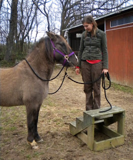 All the same, I was pretty cautious about this next step. I've been a little worried that I would be too big for the pony--height and weight wise--and I didn't want to jump on and injure him. I realize this is kind of silly--smaller, stocky horses have carried full grown men around, after all. But I didn't want to lose some of the goodwill between us by doing this part wrong. So, as we were by the fence for grooming I started messing around a little bit: standing on cinder blocks, leaning over his back, giving his topline a good rub, and stretching my leg over his back.
